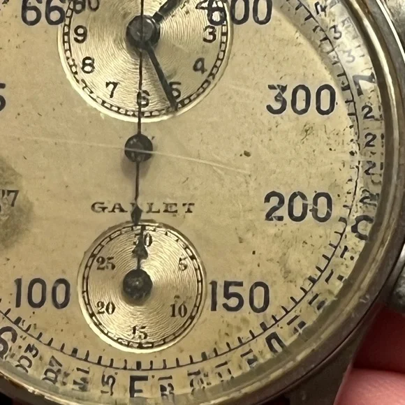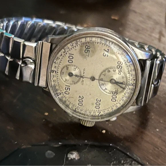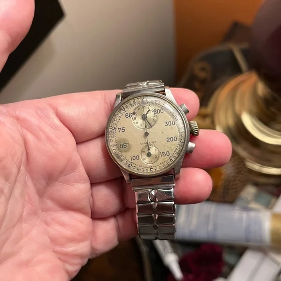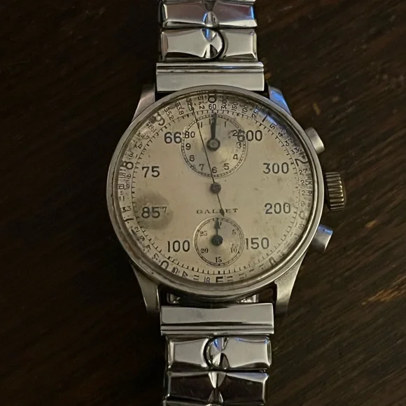 Galette, Swiss-manufacture, 1935-44 “Multi-Chron Regulator Scientific, two-register with decimal reading.Provenance - Estate of Lt. Col. Henry D. Klepacki, officer with Patton’s Third Armored Division.Watch was given to Klepacki when a medic with the 45th Medical Corps passed away in Belgium.Watch Specifics:Movement is manual wind.Calibration - Venus 140Case and band are solid stainless steel, band is flexible spring and original.Dimensions: 31mmProduced between 1937-1942There are no serial numbers, though Col. Klepacki noted #56699 - I do not know what significance that might mean. The winding mechanism winds smoothly:neither overwound or loose.When wound, the hands begin their circuits with no visible lag.The ticking of the mechanism is clearly audible.It is remarkable that the piece is still running.The watch shows it’s nearly 90-year age in that the crystal has clouded, has some scratching and the numerals have faded from navy blue to black.There is also a brownish, small circular discoloration on the lower left. According to the website GalletWorld, this is one of the rarer timepieces and is valued there at $5-5500.00 Thank you for looking.NO international shipping - an international purchase will be cancelled.PAYMENTS - Major Credit Card/PayPal ONLY. NO refunds/returns.Priced based on condition historic significance wthe 45th Med Corps, World War 2 Ships upon receipt & cleared payment. NO sale to anyone w/o feedback!!!