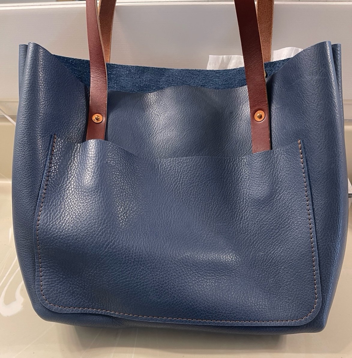 Purchased BST, but never used by me. This bag is made of lovely, supple smoky blue leather and features two inside pockets. My toxic trait is that I buy small bags and never use them. :-|