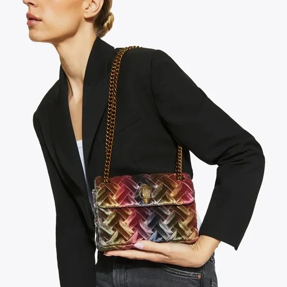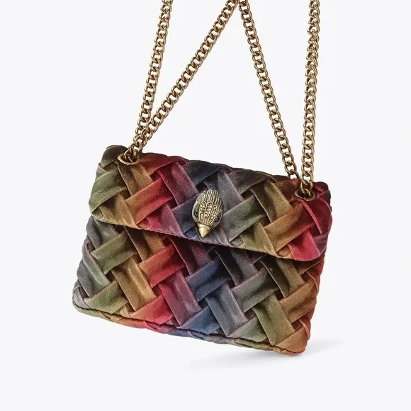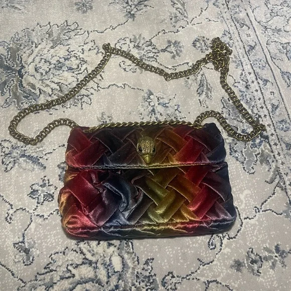 Like new without tagFrom Kurt Geiger London, the Mini Kensington Velvet Woven Crossbody Bag features:Velvet synthetic exteriorSynthetic liningSnap closure1 interior compartment and 1 slip pocketEagle head ornamentAdjustable chain strapGold-toned hardwareApprox. 7.67" x 5.11" x 2.75" bagStrap drop approx. 23.22"