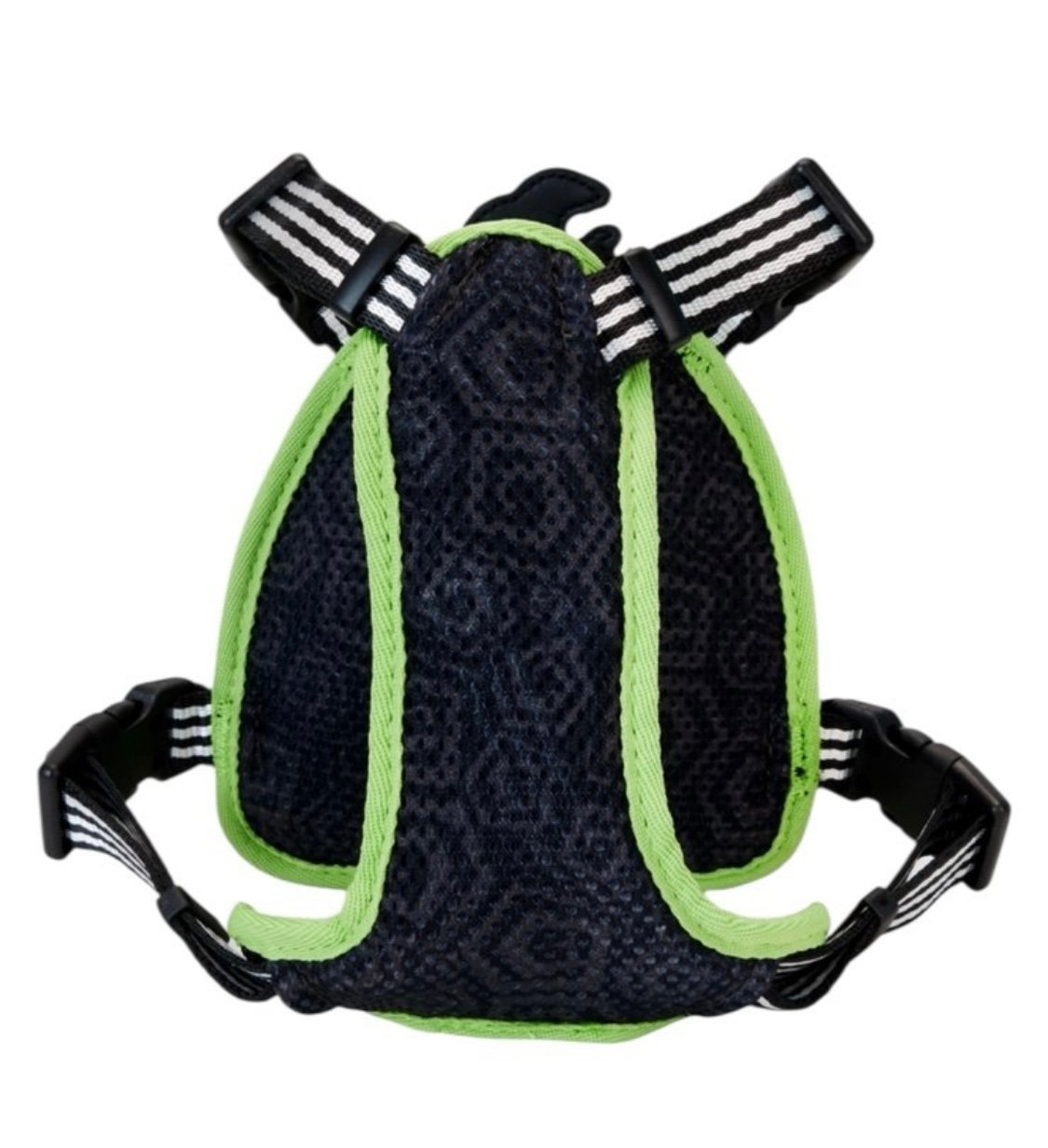 This harness features Beetlejuice and his splendid striped suit. In the dark, the creepy-crawly bugs printed on the front glow! Store some extra treats and other necessities in the zippered compartment. For the medium and large sizes, there’s a front-zipped pocket for storing even smaller items on your journeys. Beetlejuice’s applique head and hair stick up over the top of the pocket on the medium and large sizes. In the dark, for the medium and large sizes, Beetlejuice’s hair also glows, in addition to the bugs. Step out in show-stopping style with this must-possess accessory.
