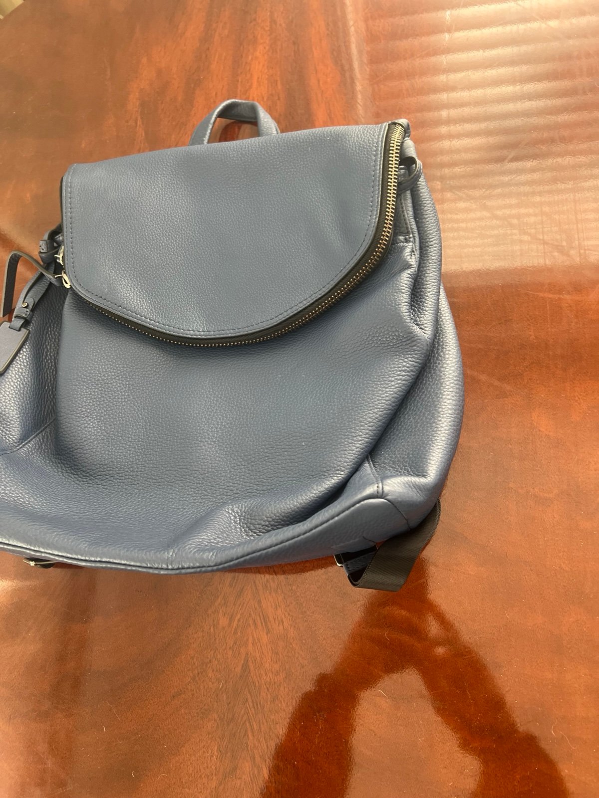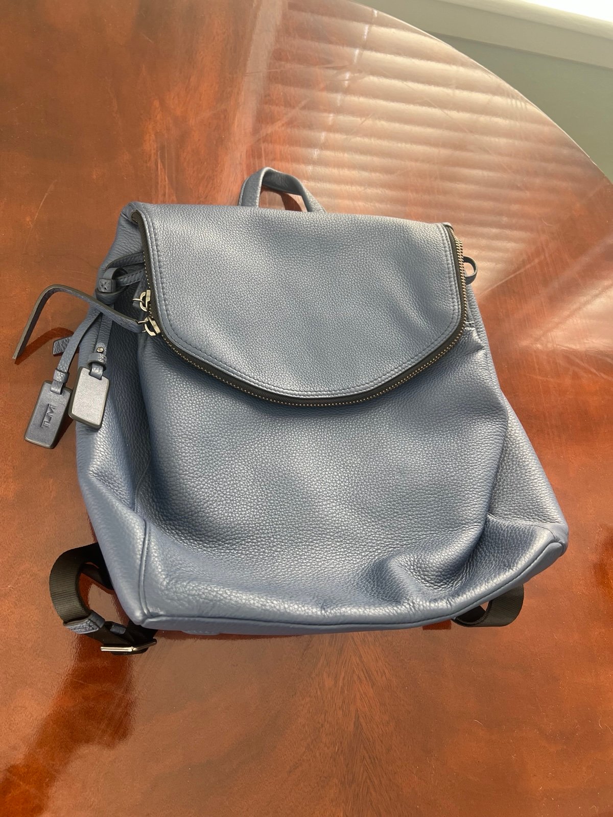 Premium TUMI leather backpack in a rare navy finish. Sleek flap-top design with zip accent, padded laptop compartment (fits up to 15”), and multiple interior pockets. Excellent condition clean inside and out.